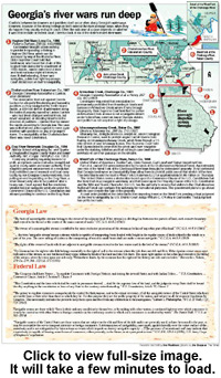 landowners and the natural rights of people to recreate on public land are clashing. "It's a huge issue now and it will grow," said Risa Shimoda Callaway, a director of American Whitewater, a national nonprofit organization dedicated to conservation and access issues. "As people become more mobile, as people have more resources to travel, as people are more aware of enjoying natural resources that are out of urban and suburban areas, and as contractors, developers and private citizens continue to purchase and develop land, access becomes an issue." The conflict in North Georgia is a confusing amalgam of the old and the new, of state and federal laws, of mountains and streams. Its cast of characters includes landowners and land managers, bureaucrats and businessmen, environmentalists and adventure seekers and lawyers, plenty of lawyers. And much of it involves a splitting of legal and philosophical hairs that would make Mother Nature and Uncle Sam cringe. Nowhere has this tug-of-war played out more dramatically than on Georgia's rivers and streams, where the dispute over what is public and what is private is as murky as the Chattahoochee River after a hard rain.